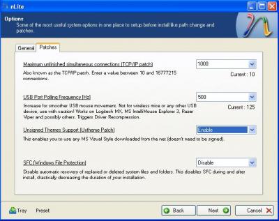 # Options উইন্ডোর Patches ট্যাব থেকে Maximum unfinished simultaneous connections সেট করুন ১০০ থেকে ১০০০ এর মধ্যে। USP Port Polling Frequency এ প্রয়োজনমত USP Polling Frequency সেট করুন। Unsighned Themes Support আপনাকে 3rd Party Themes ব্যবহার করতে দেবে সেক্ষেত্রে এটি Enable রাখুন। Windows File Protection এটি আদতে সুবিধাজনক মনে হলেও এটি Disable রাখাই আমার মনে হয়েছে ভাল, কারন প্রয়োজনে অনেকসময় Windows File চেঞ্জ করার দরকার হতে পারে।