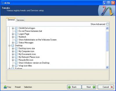 # এবার Next করে Tweaks উইন্ডো থেকে প্রয়োজনীয় টোয়ীক এবং সার্ভিস নির্বাচন করুন। এগুলো হচ্ছে উইন্ডোজের বেসিক সেটিং যেমন : ডেক্সটপে মাই কম্পিউটার আইকন থাকবে কিনা, উইন্ডোতে সাইড ম্যানুতে কি কি অপসন থাকবে, কন্ট্রোল প্যানেল কিভাবে সাজানো থাকবে ইত্যাদি।