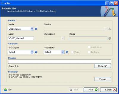 # প্রসেস শেষ হলে Next করলে Bootable ISO উইন্ডো আসবে। এখান থেকে আপনি সরাসরি সিডিতে রাইট করতে পারবেন বা বুটেবল ইমেজ তৈরী করতে পারবেন পরবর্তিতে রাইট করার জন্য। বুটেবল ইমেজ তৈরী করতে Mode এ Create Image নির্বাচন করে Label লিখে Make ISO বাটনে ক্লিক করুন।