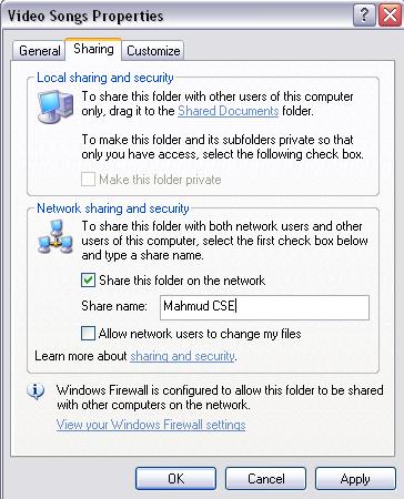 এখানে Share this folder on the network এ টিক দিন এবং ফোল্ডারটির নাম দিন। এতে এই ফোল্ডারটি নেটওয়ার্কের সব কম্পিউটারের জন্য Read Only হিসেবে দেখাবে অর্থাৎ নেটওয়ার্কের সবাই ফোল্ডারটি দেখতে পারবে, Copy করতে পারবে কিন্তু Delete, Cut বা Edit করতে পারবে না। যদি আপনি অন্য কম্পিউটারগুলোকেও ফোল্ডারটি Delete, Cut, Edit করার পারমিশন দিতে চান তাহলে Allow Network users to change my files এ টিক দিয়ে দিন। ব্যাস... ফাইল/ফোল্ডার শেয়ারিং শেষ।