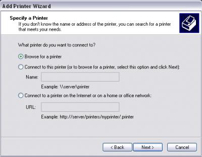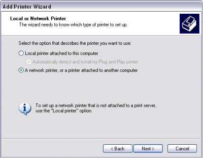 এখানে Share Name এ প্রিন্টারটির নাম দিন। Apply দিয়ে বের হয়ে আসুন। এতেই প্রিন্টারটি নেটওয়ার্কের সব কম্পিউটারের জন্য শেয়ার হয়ে যাবে। এখন অন্যান্য কম্পিউটারগুলোতে Control Panel > Printers & Faxes এ গিয়ে Add a Printer এ ক্লিক করুন। Next দিয়ে নিচের উইন্ডোটি পাবেন :