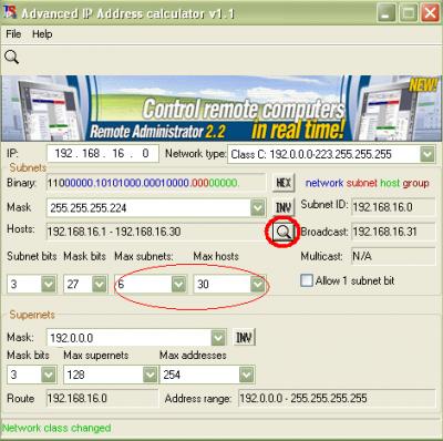 ধরুন, আপনি 180 টি কম্পিউটার নিয়ে বড় একটি নেটওয়ার্ক তৈরী করতে চান। যেখানে সাবনেট থাকবে 6 টি এবং প্রতিটি সাবনেটে হোস্ট কম্পিউটার থাকবে কমপক্ষে 30 টি। IP Address দেয়া হলো 192.168.16.0 এবং সাবনেট 255.255.255.0। কিভাবে করবেন?