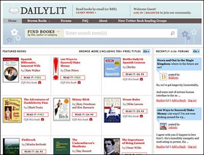 চরম মজার ওয়েবসাইট DailyLit।এখানে অনেক বই পাবেন পরার জন্য ফ্রী।এটা কিন্তু মজার না মজার হল আপনি রাত ১২ টায় আপনার প্রিয় বইয়ের কিছুটা পড়ে ঘুমাতে যেতে চান,DailyLit এ যান পছন্দের বই সিলেক্ট করুন আর কখন পড়তে চান টাইম দিয়ে দিন।ব্যস DailyLit প্রতিদিন আপনাকে বইটির কিছু অংশ আপনাকে মেইল করে পাঠিয়ে দিবে নির্দিষ্ট সময়ে।তবে একটি কথা খুব নতুন বই পড়তে টাকা খরচ হতে পারে।