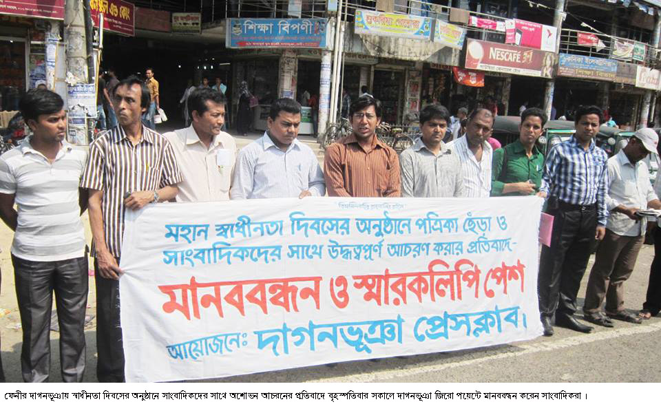 স্বাধীনতা দিবসের অনুষ্ঠানে সাংবাদিকদের সাথে অশোভন আচরনের প্রতিবাদে ফেনীর দাগনভূঞায় সাংবাদিকদের মানববন্ধন ও স্মারকলিপি পেশ