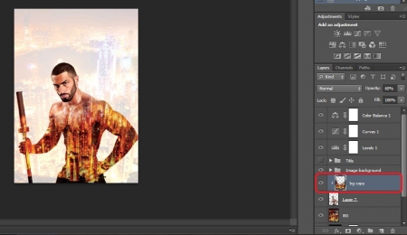 ৪। এর পর background ইমেজের উপর মাউস রেখে keyboard Ctrl + J বাটন চাপি। এর ফলে background ইমেজের একটা কপি হবে। এর opacity 60 করে দেই।