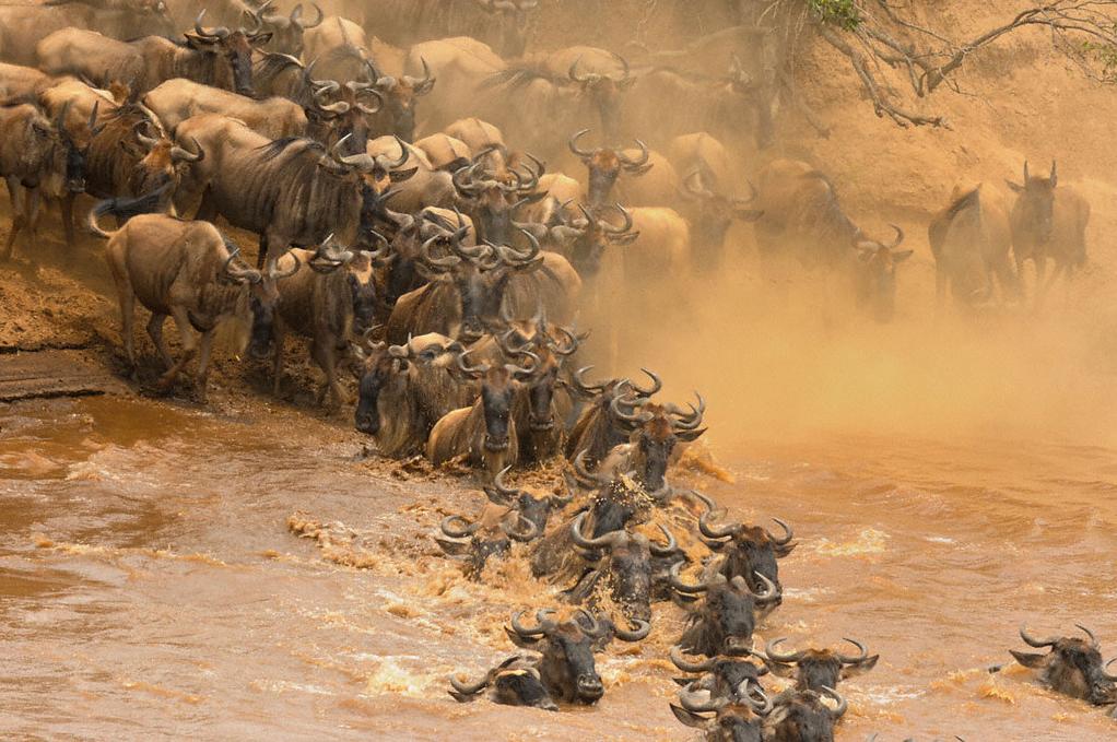 ওয়াইল্ডবিস্টের দীর্ঘ্য পরিযায়নের পুরো পথটিই নানা বিপদ ও প্রতিকুলতায় ভরা হলেও তবে তাঁদের সবচেয়ে বেশী ক্ষতির মুখোমুখি হতে হয় 'গ্রুমেতি’ ও ‘মারা’ নামক দুটি নদী পাড় হতে গিয়ে। এই দুটি নদীকে বলা হয়ে সাক্ষাত মৃত্যুর উপত্যকা। এখানে শত শত কুমির অপেক্ষায় থাকে কখন ওয়াইল্ডবিস্টের দল এই জায়গা দিয়ে পাড় হবে। এই নদীগুলো পাড় হতে থাকার দৃশ্যও প্রকৃতির এক বিরল দৃশ্য। লক্ষ লক্ষ ওয়াইল্ডবিস্ট নদীর তীরের সমভূমিতে জড়ো হতে থাকে। এরপর হটাৎ একটি মাত্র স্থান দিয়ে লাইন ধরে পাড় হতে থাকে নদী। পাড় হতে থাকা ওয়াইল্ডবিস্টের উপর হামলে পড়ে দলে দলে ক্ষুদার্ত কুমির। এসব কুমিররা শিকারেও অত্যন্ত দক্ষ। বিশাল বিশাল শক্তিশালী একেকটা ওয়াইল্ডবিস্টকে তারা মুহুর্তেই হত্যা করে ফেলে। নদীগুলিতে পড়ে থাকে অনেক মৃতদেহ। এইসকল মৃতদেহ খেয়ে জীবন কাটায় কুমির, শকুন সহ আরো অনেক প্রাণী। এত বিপদের মধ্যেও ওয়াইল্ডবিস্ট এর দল এগিয়ে চলে সামনের পথে, জীবনের পথে। ছবিঃ ইন্টারনেট
