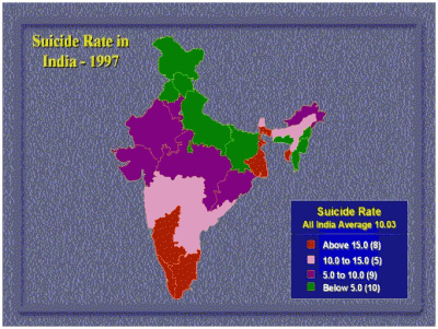 ভারতে এখন সবচেয়ে বেশি আত্মহত্যা প্রবন বলাহয় ১৫ থেকে ২৯ বছর বয়সি হুবক বা জুবতী দের। এদের মধে আত্মহত্যা এর পরিমান ১০০,০০০ জনের মধে ১৫ জন প্রতিবছর। জা অন্ন কনো দেশের থেকে অনেক বেশি। জত বয়শ বারতে থাকে আত্মহত্যা এর প্রবনতা কমতে থাকে। ভারতে এই মুহুরতে আত্মহত্যা এর পরিসঙ্খান ৯ জন প্রতি ১০০,০০০ জনের মধ্যে প্রতিবছর। যেখানে পুরুষ আত্মহত্যাকারী এর সংক্ষা ১১ জন ও মহিলা আত্মহত্যাকারী এর সংক্ষা ৮ জন প্রতি ১০০,০০০ জনের মধ্যে প্রতিবছর।