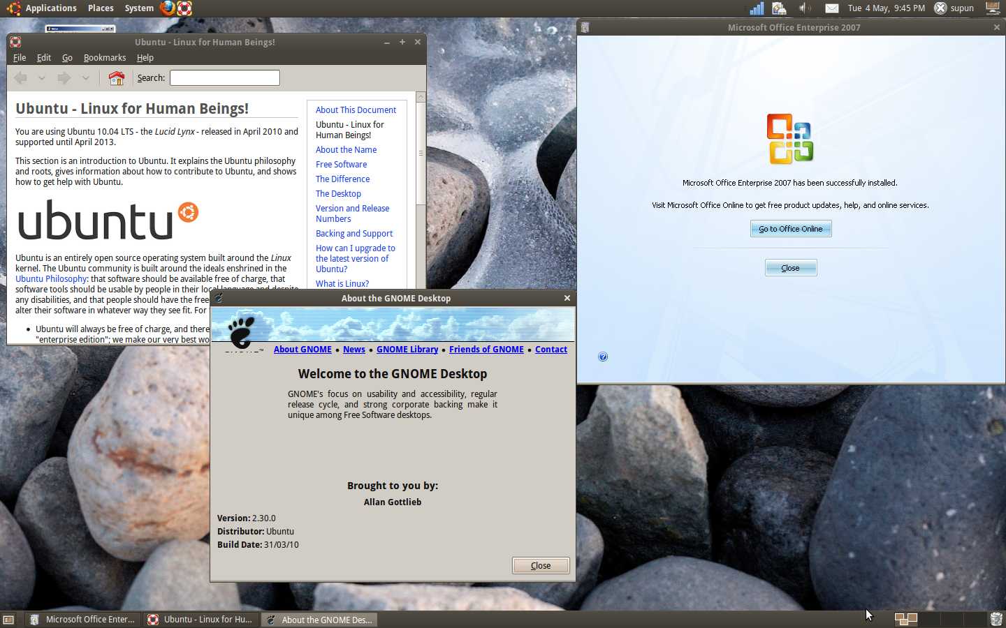 তবুও আপনার MS Office ই লাগবে ? কারণ আপনি অনেক কষ্ট করে বাসার পাশের কম্পিটার দোকান থেকে MS Officeএর একটা চোরাই ভাসর্ন ৫০ টাকা দিয়ে কিনেছেন, ঐ ৫০ টাকার কি কোনই দাম নাই ??? আচ্ছা , তাইলে শোনেন, Ubuntuতে MS Office ও চলে … … Wine (উবুন্টু একটা সফটওয়্যার প্যাকেজ) দিয়ে MS Office ও চালানো যায় … … হায় , হায় , কয় কি !!! MS Office উবুন্টুতে চলে !!! !!! চাপা মারার আর জায়গা পায় না … … ঠিক আছে, প্রমাণ দেখেন, নিচের ছবিটা দেখেন :