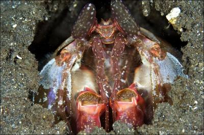 শিকারি ফরিংয়ের সাথে আকৃতিগত মিল থাকায় এই চিংড়ির এমন নামকরণ । এর ধারালো শুঁড়ের মাথায় খাঁজকাটা শীর্ষভাগের সাহায্যে শিকার বিঁধিয়ে বধ করতে এর জুড়ি নেই ।