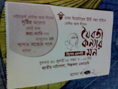 গতকাল পর্যন্ত প্রথম এবং শেষ মঞ্চ নাটক দেখেছিলাম ঠিক দশ বছর আগে- বিশেষ কারণে এখনও মনে আছে নামটা- সেগুন বাগিচার মুক্তিযুদ্ধ যাদুঘরের ছোট্ট এক চিলতে মঞ্চে দেখা 'নাগরিকের - জয়জয়ন্তী' - খুব ভাল লেগেছিল। কিন্তু হলে কি হবে- তারপর কেটে গেছে এক দশক মঞ্চ নাটক আর দেখা হয় নাই। আজকে সকালে যখনি পোস্ট দেখলাম- এ কদিনে সবার অতি পরিচিত আপনজন হয়ে যাওয়া শ্বাশত সত্য' র সাহায্যার্থে ঢাকা থিয়েটার তাদের ৩৫তম বর্ষে জাতীয় নাট্যশালা- শিল্পকলা একাডেমিতে সন্ধ্যায় মঞ্চস্হ করবে অকাল প্রয়ান সেলিম আল দীনের লেখা এবং সাহসী মুক্তিযোদ্ধা নাসির উদ্দিন ইউসুফ বাচ্চুর নির্দেশনায় 'যৈবতী কন্যার মন' তখনি মন ঠিক করে ফেলেছি এটা মিস করা চলবে না। এখন প্রশ্ন হলো টিকেট পাবো কোথায় - তারও সমাধান পেলাম সুহৃদ মেসবাহ যায়াদ ভাইয়ের সাথে মুঠোফোনে কথা বলে- আজকেই ওনার সাথে পরিচয় হলো।