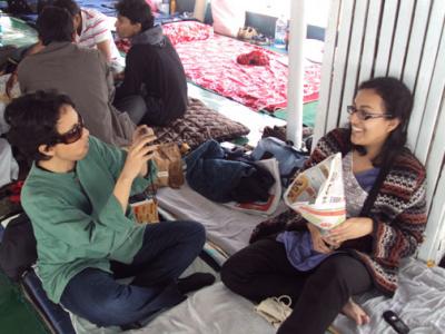 বিভিন্ন রঙ্গের ১০০ গজের একটি বিশাল পতাকা (যার মধ্যে আবার কন্টকীর বিশাল মুখোশ আঁকা রয়েছে) জাহাজের উপরে টানিয়ে দেয়া হলো। সবার সহযোগিতা নিয়ে বিশাল পতাকাবাহী বাঁশটিকে জাহাজের সামনের দিকে দাঁড় করিয়ে দেন রাশেদ আর রিয়াজ। সবাই বেশ আনন্দের মুডেই আছে। ছাদে দাঁড়িয়ে বিদায় জানাচ্ছে ঢাকাকে। মোটামুটি বিকেল সাড়ে চারটা নাগাদ দুপুরের খাবার দিয়ে দেয়া হলো। খাবার খেয়ে বেশিরভাগই ছাদে ইঠে গেলো। নিচে গান চলছে। উপরে আড্ডা আর ছবি তোলা। আমাদের সাথে যাচ্ছেন- বাংলাভিশন, বৈশাখী আর দেশটিভির বন্ধুরা। এছাড়াও আছেন- বিডি নিউজ ২৪.কম, ইত্তেফাক, ডেইলি স্টার, যুগান্তরসহ কয়েকটি প্রিন্টিং মিডিয়ার সাংবাদিকরা। এছাড়াও প্রায় সবার কাছেই রয়েছে ডিজিটাল ক্যামেরা। আস্তে আস্তে সূর্য ডুবে গেলো। তীব্র শীত। আমরা সবাই ছাদ থেকে নেমে এলাম নিচে।