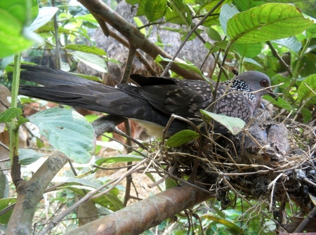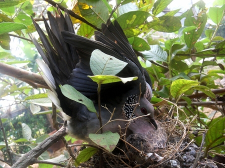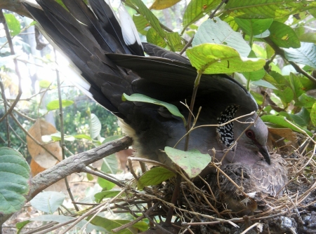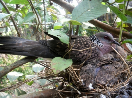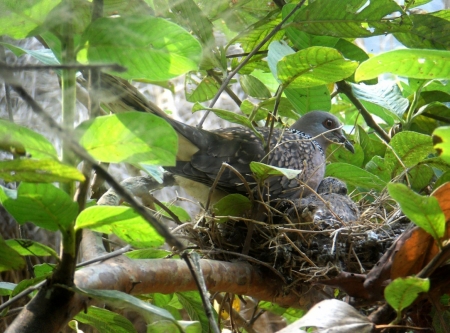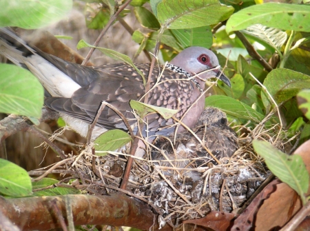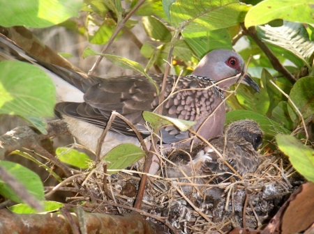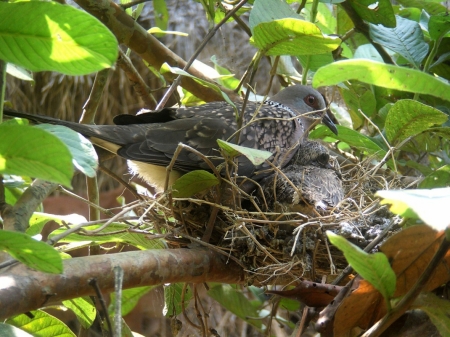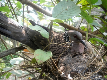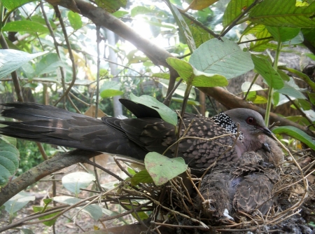 শিকারীর শ্যেন দৃষ্টি কবলে পড়ে দেশি প্রজাতির পাখি দিন দিন কমে যাচ্ছে। সব শিকারীর চোখ ফাঁকি দিয়ে পেয়ারা গাছে বাসা বেঁধেছে ঘুঘু পাখি। ডিম ফুটে দুটি ছানাও বের হয়েছে। এখনও ওড়া শেখা হয়নি বলে মা পাখিটি পরম মমতায় বুকে আগলে রাখছে ছানা দুটিকে। ঘুঘু পাখি সাধারণত লোকালয়ের ছোট ঝোপঝাড়ে, বাড়ির আশপাশে বাসা বাঁধতেই বেশি পছন্দ করে। পরিবেশের ভারসাম্য রক্ষায় পাখি সংরক্ষণে সকলের যত্নবান হওয়া দরকার।