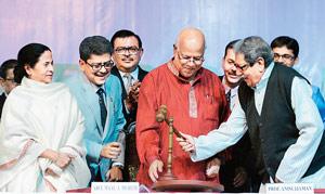 এক মঞ্চে দুই বাংলা। শনিবার মুখ্যমন্ত্রীর উপস্থিতিতে কলকাতা বইমেলার উদ্বোধন করছেন