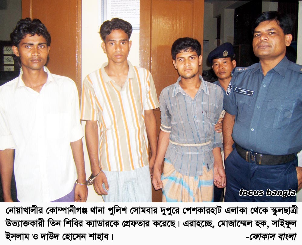 নোয়াখালীর কোম্পানীগঞ্জ থানা পুলিশ সোমবার দুপুরে পেশকারহাট এলাকা রাস্তার মাথায় অভিযান চালিয়ে স্কুলছাত্রী উত্যাক্তকারী তিন যুবককে গ্রেফতার করেছে। এরাহচ্ছে, শিবিরের কর্মী দাউদ হোসেন শাহাব(২৫), সাইফুল ইসলাম(২২) ও মোজাম্মেল হক(২১)। কোম্পানীগঞ্জ থানার এসআই ইসমাইল খন্দকার বলেন, এক স্কুল ছাত্রীর অভিভাবকের অভিযোগের ভিত্তিতে দুপুর ১২টার দিকে পেশকারহাট এলাকা থেকে তাদেরকে আটক করা হয়েছে।