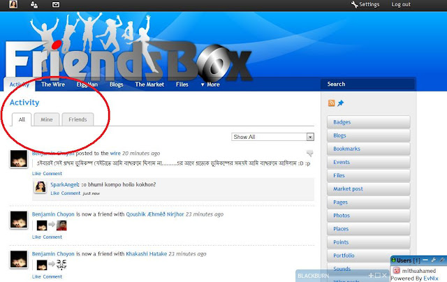 লক্ষ্য করুন এখানে ৩ টা অপশন রয়েছে আপনি চাইলে FriendsBox সবার কার্যক্রম এক সাথে দেখতে পারবেন অথবা শুধু মাত্র আপনার পোস্ট করা document সমূহ আবার এমনকি শুধু আপনার friend list এ থাকা friend দের কার্যক্রম দেখে নিতে পারবেন এক ঝলকে যদি আপনার হাতে সময় কম থাকে, এই সুযোগটি থাকার জন্যে FriendsBox আমি ডেভেলপার Black Burn Moonlit কে বিশেষ ভাবে ধন্যবাদ দিতে চাই তার কারণ হচ্ছে আমার নিজের হাতে সময় কম থাকে সমস্ত বন্ধুবান্ধব এর খোজ নিতে পারি না ঠিক মত , এই সুবিধাটির কারণে সবাইকে এক নজর দেখে নেয়া যায় কে কেমন আছে...