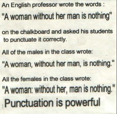 দাঁড়ি, কমা, সেমি-কোলনের জায়গামত ব্যবহারের কারনে কোন বাক্যের অর্থ সম্পূর্ন পরিবর্তীত হতে পারে। যেমন: