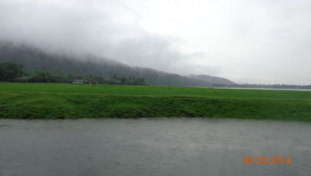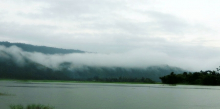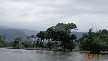 ক্রমাগত বৃষ্টি আর পাহাড়ি ঢলে পানি প্রায় রাস্তা ছুঁই ছুঁই। সকালের ঝিরিঝিরি বৃষ্টি এখানে রুপ নিল প্রবল বর্ষনে। রাস্তার এক পাশে দিগন্ত বিস্তীর্ন বড় ঢেউয়ের হাওড় আর অন্যপাশে বিচ্ছিন্ন দ্বীপের মত কিছু বাড়ি আবার কোথাও বা একদম ফাঁকা। এরই মধ্যে একটু পর পর পানি নিমজ্জিত গাছপালা। শুনলাম, এই গাছগুলো রাতারগুল রিজার্ভ ফরেস্টেরই অংশ। পাহাড়ি বৃষ্টিতে সাত সকাল গোসল করে যখন হাঁদার পাড়ে এসে পৌছলাম তখন ঘড়িতে প্রায় সাড়ে নয়টা। এক রাউন্ড চা পান করে যখন নৌকা ভাড়া করার জন্য অপেক্ষা করছি তখনই বৃষ্টি কিছুটা ধরে এলো আর সাথে সাথে চোখে পড়ল দূরে অবস্থিত মেঘাচ্ছন্ন পাহাড় আর ঝর্না। আকস্মিক এই পরিবর্তনে সবাই বিস্মিত হয়ে একে অপরের দিকে তাকিয়ে জিজ্ঞেস করলাম, ঐটাই কি স্বর্গ নাকি বিছানাকান্দি?