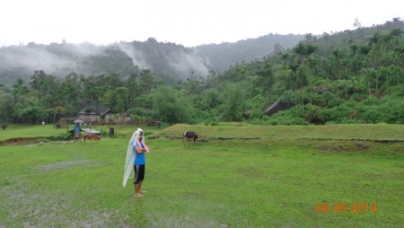 এইভাবে বেশ কিছুক্ষন চলার পরে, আমরা যখন বুঝতে পারছি না, কোন দিকে যাচ্ছি তখনই ঠিক সামনে উদয় হলো বিশাল এক পাহাড় আর ছবির মত সুন্দর একটা গ্রাম। সত্যি বলতে, এমন একটা দৃশ্যের জন্য আমরা ঠিক প্রস্তুত ছিলাম না। গ্রামের একটা অংশ পড়েছে ভারতে আর একটা অংশ বাংলাদেশে।