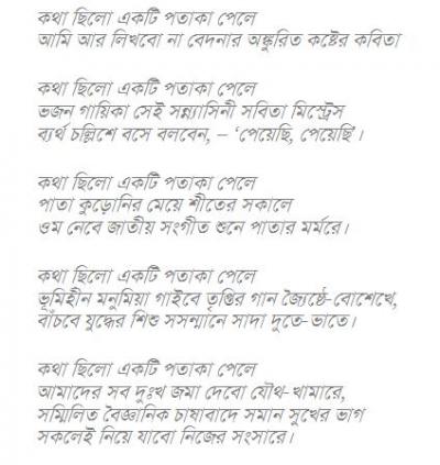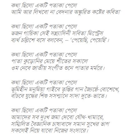 বেদনার অঙ্কুরিত কষ্টটুকু ভুলতে চাওয়া কবি স্বপ্ন দেখেছেন কবি মানসের অনিবার্যতা থেকে। স্বপ্ন দেখেছেন সব শোষণ বঞ্চনা অবসানের। স্বাধীনতা আমাদের আজন্ম লালিত সাধ, রক্তবীজের প্রলয় স্পন্দন। আমরা কামনা করেছিলাম একটি সুখী স্বাধীন ও প্রকৃত অর্থেই সার্বভৌম রাষ্ট্রের। যেখানে আমরা ভুলে যাব জাত, পাত, ধর্ম বর্ণের বাধা। যেখানে আমাদের পরিচয় হবে আমরা মানুষ। পর্দা ছেড়ার স্পর্ধায় আকাশ ছোবে দেশের সাত কোটি মানুষ। আমাদের এমনই অনেক আশা ও স্বপ্নের বয়ান করেছেন কবি তার এই কবিতায়। সরাসরি তা হয় তো প্রকাশিত নয়, তবে অর্ন্তনিহিত ভাবে তা একান্তই আশার প্রতীক। যে আশা সব হারানো কাউকেও ফিরিয়ে দিতে পারে সঞ্জীবনী সুধা। যে মধুর মুরতি লাভে ভজন গায়িকা সবিতা মিস্ট্রেস ব্যর্থ চল্লিশে এসেও বলতে পারেন ‘পেয়েছি পেয়েছি’ । এমনি ভাবে কবিতায় আরো এসেছে ছোট ছোট চিত্ররূপ।