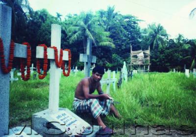 কাজের ফাঁকে স্থানীয়দের অতিপ্রিয় একজনের সমাধীর পাশে আমি। অদূরে নির্মানাধীন ভাস্কর্য।