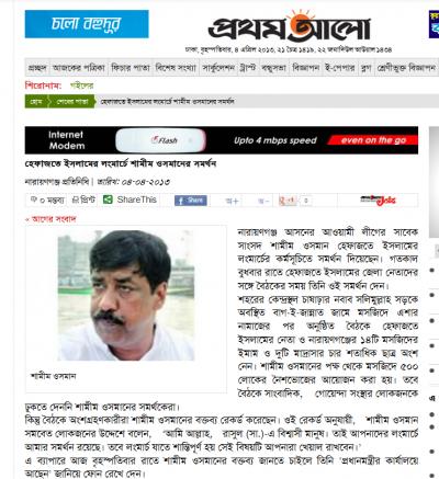 নারায়ণগঞ্জ আসনের আওয়ামী লীগের সাবেক সাংসদ শামীম ওসমান হেফাজতে ইসলামের লংমার্চের কর্মসূচিতে সমর্থন দিয়েছেন। গতকাল বুধবার রাতে হেফাজতে ইসলামের জেলা নেতাদের সঙ্গে বৈঠকের সময় তিনি ওই সমর্থন দেন। শহরের কেন্দ্রস্থল চাষাঢ়ার নবাব সলিমুল্লাহ সড়কে অবস্থিত বাগ-ই-জান্নাত জামে মসজিদে এশার নামাজের পর অনুষ্ঠিত বৈঠকে হেফাজতে ইসলামের নেতা ও নারায়ণগঞ্জের ১৪টি মসজিদের ইমাম ও দুটি মাদ্রাসার চার শতাধিক ছাত্র অংশ নেন। শামীম ওসমানের পক্ষ থেকে মসজিদে ৫০০ লোকের নৈশভোজের আয়োজন করা হয়।