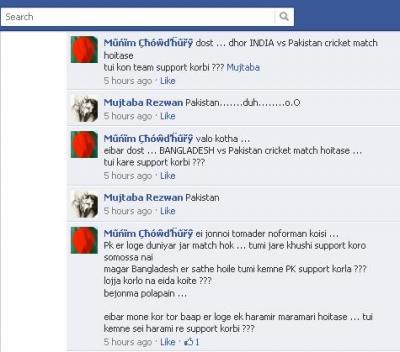 বুঝলাম তুমি পাকিস্তান কে সমর্থন কর, আফ্রিদি মেসবাহ তোমার প্রিয় খেলোয়ার কিন্তু নিজের দেশের সাথে খেলা হইলে তুমি কিভাবে নিজে দেশ বাদ দিয়ে অন্য একটা দেশকে সমর্থন কর ??? লজ্জা করে না এইটা বলতে ??? নাকি তুমি জারজ পোলা হওয়ার কারনে ওইটা তোমার বাপের দেশ তাই তুমি তার সমর্থন কর ???