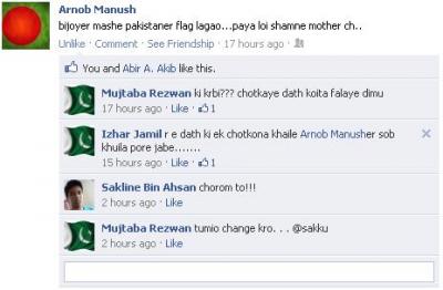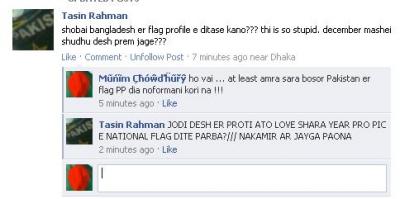 কিন্তু তার প্রোফাইল পিকটা দেখেন ... সেখানে একটা পাকিস্থানের পতাকা। তার কথা গুলা দেখেন ... এবং তার পোস্টের শেষ মন্ত্যব্যটা দেখেন। আরেক জারজ পোলায় কি কয় ... ছিঃ !!!
