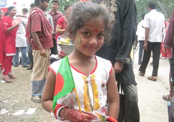 “এরকম পহেলা বৈশাখ প্রতিদিন চাই” হাসিমুখে যেন এই কথাটিই বলতে চাইছে জাতীয় পতাকা হাতে শিশুটি