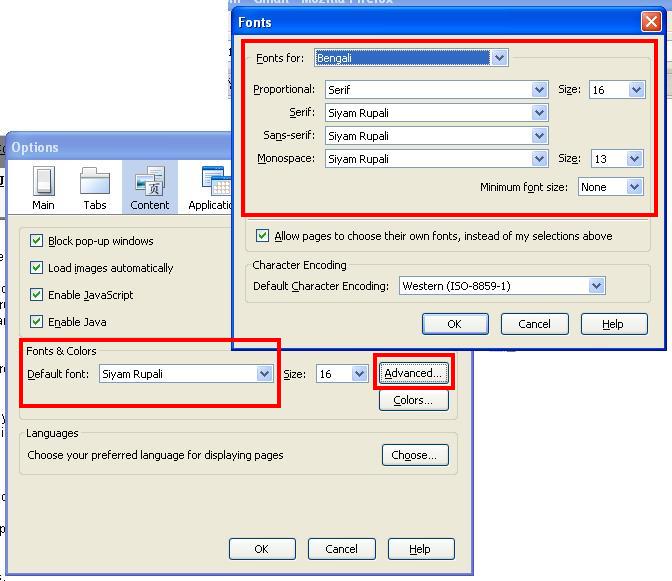 ফন্ট পরিবর্তন করতে Tools >> Options নির্বাচন করুন। এবার “Contents” থেকে বাংলার জন্য ডিফল্ট ফন্টটি পরিবর্তন করতে হবে । এজন্য Fonts and Colors অংশের Advanced বাটনে ক্লিক করুন। এই কাজটি করলে Fonts নামে নতুন একটি উইন্ডো ওপেন হবে Fonts for অংশ থেকে Bengali নির্বাচন করতে হবে এবং নিচের ছবির মত ডিফল্ট vrinda ফন্টটি পরিবর্তন করে Siyam rupali বা Solaimanlipi ফন্টটি ব্যবহার করতে পারেন । এখানে ফায়ারফক্সের কথা বলা হলেও ফায়ারফক্সে ভিত্তিক অন্যন্য ওয়েব ব্রাউজারেও একই পদ্ধতিতে ফন্ট পরিবর্তন করা যাবে।