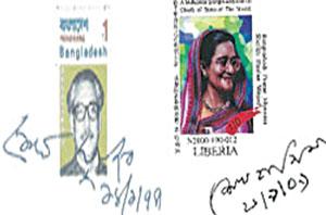 ৩৫ বছরের ব্যবধানে অদ্ভূত যোগসূত্র পিতা-কন্যার মধ্যে। আর এটি স্থাপিত হয় ড. এলেন হেম্যান নামে শ্বেতাঙ্গ একজন আমেরিকানের মাধ্যমে। জাতিসংঘ সাধারণ পরিষদের অধিবেশনে বাংলায় ভাষণদানের ৩৫ বছরের ব্যবধানের ঘটনা এটি নয়। তার চেয়েও হৃদয়গ্রাহী। ৩৫ বছর আগে ১৯৭৪ সালের ১৪ জানুয়ারি শেখ মুজিবের ছবি সংবলিত একটি স্ট্যাম্পে স্বাক্ষর তথা অটোগ্রাফ নেয়া হয় বঙ্গবন্ধু শেখ মুজিবের। গত ২৬ সেপ্টেম্বর শনিবার জাতিসংঘ সাধারণ পরিষদের অধিবেশনে ভাষণদানের পর শেখ হাসিনার মুখোমুখী হন ওই লোকটি। তার হাতে বঙ্গবন্ধুর স্বাক্ষরওয়ালা স্ট্যাম্প এবং সঙ্গে রয়েছে প্রধানমন্ত্রী শেখ হাসিনার ছবি সংবলিত আরেকটি স্ট্যাম্প। সেটির নিচে লেখা লাইবেরিয়া। ৩৫ বছর আগে বাবার অটোগ্রাফ প্রদানকৃত স্ট্যাম্প আমেরিকানের হাতে দেখে অভিভূত হন শেখ হাসিনা এবং সকলের অজান্তে তিনি ওই আমেরিকানের প্রতি সশ্রদ্ধ কৃতজ্ঞতা প্রকাশ করেন চোখের পানিতে।