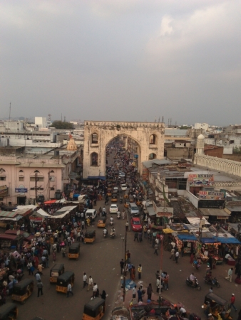 আমরা টিকিট কেটে চারমিনারের চূড়ায় ওঠার জন্য লাইনে দাড়ালাম। পেচানো সিড়ি বেয়ে উপরে উঠছি। অন্যরকম একটা অনভূতি হচ্ছে। মনে হচ্ছে চারশ বছর পেছনে চলে এসেছি। কি অসাধারন স্থাপনা। এখনও ঠিক নতুনের মতো... চারমিনারের চূড়ায় উঠে বাইরে তাকাতেই মনে হলো চাররাস্তার কেন্দ্রবিন্দুতে দাড়িয়ে আছি। চারমিনারকে কেন্দ্র করে চারদিকে চারটি রাস্তা চলে গেছে। মিনারের চূড়ায় পর্যটকদের ভির ।কোলাহল...।
