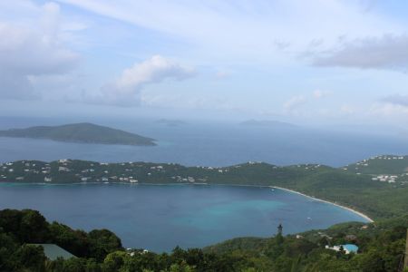 এরপর গেলাম মাউন্টেন টপে। মাউন্টেন টপ এখানকার টপরেটেড ট্যুরিস্ট স্পট। সেন্ট থমাসের সবচেয়ে উঁচু পাহাড় এই মাউন্টেন টপ। আর এখান থেকে দেখা দৃশ্য নাকি ক্যারিবীয়ান অঞ্চলের অন্যতম সুন্দর দৃশ্য! আসলেই তাই। প্রথম যখন দেখলাম, মনে হলো এই দৃশ্য কি সত্যি নাকি সিনেমাতে দেখছি! প্রায় ১৫০০ ফুট উপর থেকে দেখা যায় ইউ আকৃতির অপূর্ব নীল এক সমুদ্র সৈকত। দূরে হালকা নীল আকাশ আর ধূসর মেঘের আড়াল থেকে উঁকি দিচ্ছে নীলচে সবুজাভ কিছু দ্বীপ। সবমিলিয়ে কি এক অদ্ভুত সুন্দর দৃশ্য! আমি শব্দের কারিগর নই। তাই ভাষায় সেই সৌন্দর্যের কিছুই প্রকাশ করতে পারছিনা। উত্তর দিকের সব পাহাড়ের চূড়া থেকে এই সৈকতের খুব অসাধারণ কিছু ভিউ পাওয়া যায়। শুধু তাকিয়েই থাকতে ইচ্ছা হয়। দূরের দ্বীপগুলো ছিল ব্রিটিশ ভার্জিন আইল্যান্ডস ও অন্যান্য ইউএস ভার্জিন আইল্যান্ডস।