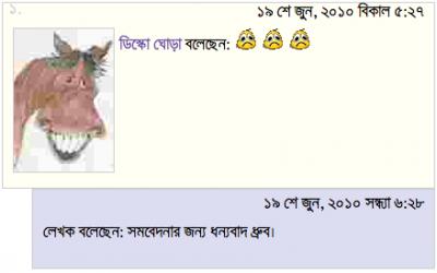 এভাবেই জনৈক ডিস্কো ঘোড়া নামক ব্লগারের Click This Link একটি দু'তিন লাইনের পোস্টে একটি ছোটো মন্তব্য রাখি। পরে আবার অনেকক্ষণ পরে ভিজিট করে দেখি আমার সেই ক্ষুদ্র মন্তব্যকেই চ্যালেঞ্জ করা হয়েছে। আমি গুছিয়ে আমার বক্তব্য পয়েন্ট আকারে দিলাম। আমার সেই মন্তব্যকে অকথ্য গালিগালাজ, আমি কেনো সে অফলাইনে গেলেই মন্তব্য করেছি তারও উত্তর জিজ্ঞেস করে। তার প্রতিলাইন মন্তব্যে আমার প্রতি গালি তো আছেই সেই সাথে আমাকে কেউ একজন না বুঝেই সমর্থন দিয়েছেন(তিনি হয়তো সামুর ব্যাপার স্যাপার বোঝেন না) তাকেও ছাগুবান্ধব গালি! তো স্বভাবতই তার পোস্টের উত্তর দেবার আমার আর রুচি হয়নি।