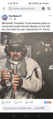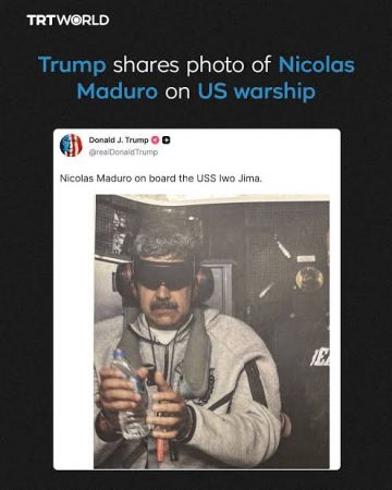 ছবিতে দেখা যাচ্ছে ভেনিজুয়েলার অত্যন্ত জনপ্রিয় কমিউনিস্ট নেতা মাদুরোর চোখে কালো পট্টি দিয়ে বাধা। তাঁর হাতে একটি জলের বোতল, রাগে-দু:খে যে বোতল তিনি দুমড়ে-মুচড়ে ফেলেছেন। তবে তাঁর স্ত্রীকে এই ছবিতে দেখা যায়নি। তাঁকে মার্কিন যুদ্ধজাহাজে আমেরিকা নিয়ে যাওয়া হচ্ছে। বেশি সময় লাগবে না।