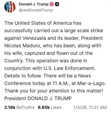 এর আগে, রাতের অন্ধকারে হঠাৎ করেই ভেনিজুয়েলার আকাশ আলোকিত হয়ে ওঠে প্রবল বোমা হামলায়। আকাশ থেকে একের পর এক বোমা ফেলা হয় মার্কিন বিমান ও হেলিকপ্টার থেকে। সেগুলো বিস্ফোরিত হতে থাকে ভুবনবিদারী শব্দে। হতচকিত নাগরিকরা কিছুক্ষণ পরেই ট্রাম্পের ট্রুথ স্যোশালের পোস্ট থেকে জানতে পারে তাদের প্রেসিডেন্টকে ধরে নিয়ে যাওয়া হয়েছে।