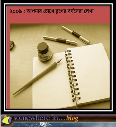 গত ১১ মাসে (জানুয়ারি ২০০৯ - ডিসেম্বর ২০০৯) সামহোয়্যারইন ব্লগে প্রকাশিত কোন লেখাটি আপনার চোখে সেরা (গদ্য ও পদ্য মিলিয়ে), তা এই পোস্টে জানাবেন কি? আপনি চাইলে এক বা একাধিক লেখাও মনোনয়ন দিতে পারেন। সেটি হতে পারে রম্য, স্মৃতিকথা, অনুবাদ, কবিতা, ছোটগল্প কিংবা সাধারণ যে কোনো পোস্ট।