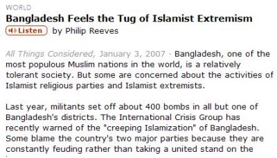 সমপ্রতি এনপিআর নিউজে বাংলাদেশের মৌলবাদের বিস্তৃতি নিয়ে একটি প্রতিবেদন শুনলাম। জানুয়ারীর 3 তারিখে প্রচারিত ফিলিপ রীভসের প্রতিবেদনে [link|http://www.npr.org/templates/dmg/dmg.php?prgCode=ATC&showDate=03-Jan-2007&segNum=15&mediaPref=RM&getUnderwriting=1|evsjv
