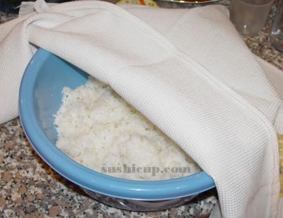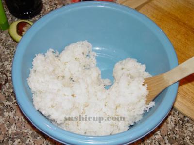 এরপর ভাত প্লাস্টিকের (বা কাঠের) পাত্রে নিতে হবে। প্লাস্টিকের (বা কাঠের) পাত্রে নেয়ার পরপরই দুই থেকে তিন টেবিল চামচ রাইস ভিনেগার দিয়ে ভাতের সাথে ভালো করে মিশাতে হবে। যদি রাইস ভিনেগার পাওয়া না যায়, তাহলে অন্য ভিনেগারেও কাজ চালানো যেতে পারে। তবে কিছুতেই ভিনেগার বেশি দেওয়া যাবে না। এতে সুসি টক হয়ে যাবে।