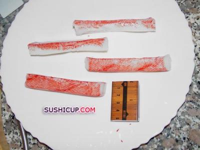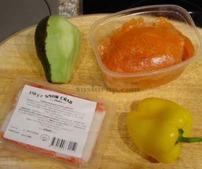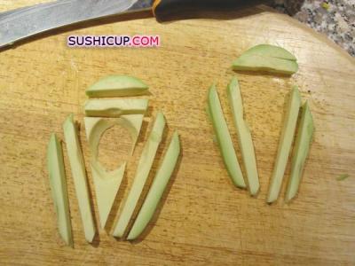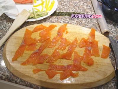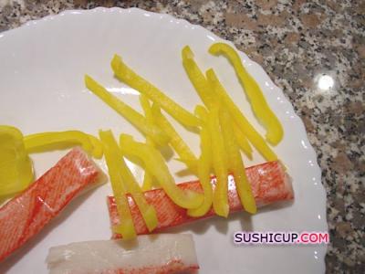 এরপর মাকি সুসি রোল তৈরী করতে, ক্রাব স্টিক, ক্যাপসিকাম, অ্যাভোকেডো ও সুসি মাছ নিচের ছবির মতো করে লম্বা লম্বা কুচি করে কাটতে হবে...
