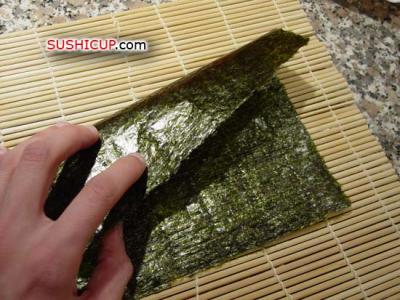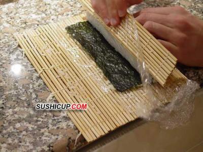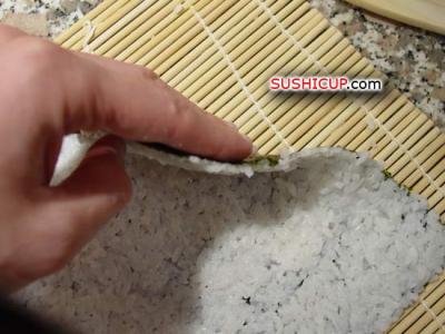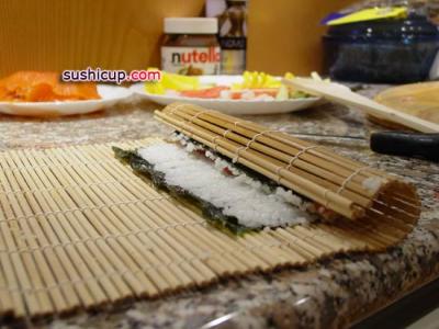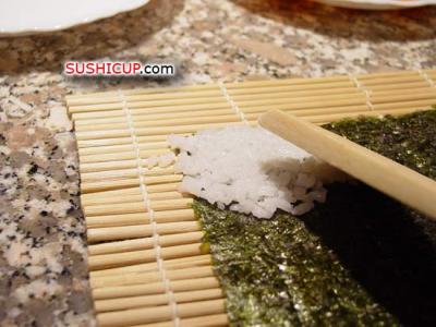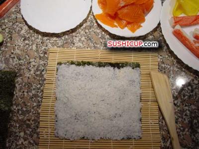 ৩) সুসি ম্যাটের উপর নেরি বিছিয়ে তার উপর আগে তৈরী করা ভাত বিছিয়ে দিতে হবে। এক্ষেত্রে নেরির মসৃণ অংশ থাকবে ম্যাটের উপর আর অমসৃণ অংশের উপর ভাত বিছিয়ে দিতে হবে।