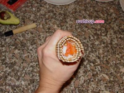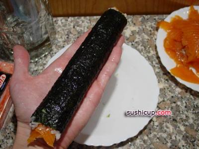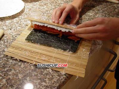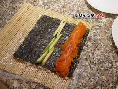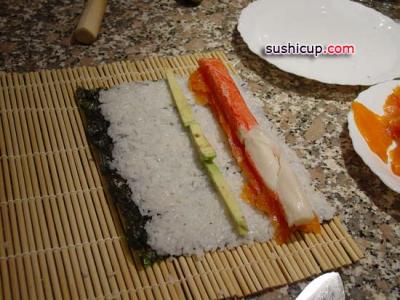 তার উপর পূর্বে তৈরীকৃত নোরি ভাতের স্টিপটা উল্টা করে বিছাতে হবে। অর্থাৎ এবার ভাতের অংশটা থাকবে নিচের দিকে ও নোরি থাকবে উপরের দিকে। এর উপরে সুসি মাছ, অ্যাভোকেডো, ক্যাপসিকাম, ক্রাব স্টিক গুলো আগের মতো করেই বিছিয়ে দিতে হবে...