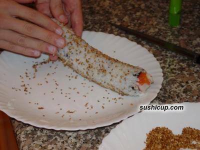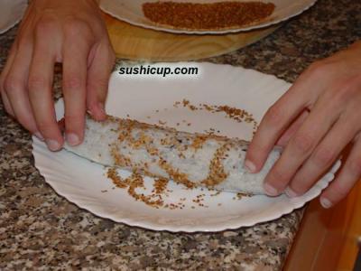 ভাজা তিসি একটা প্লেটে নিতে হবে। এই প্লেটের উপর ক্যালির্ফোনিয়া রোলটা গড়িয়ে নিতে হবে...