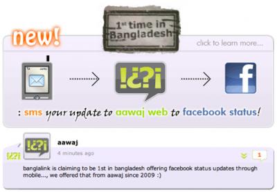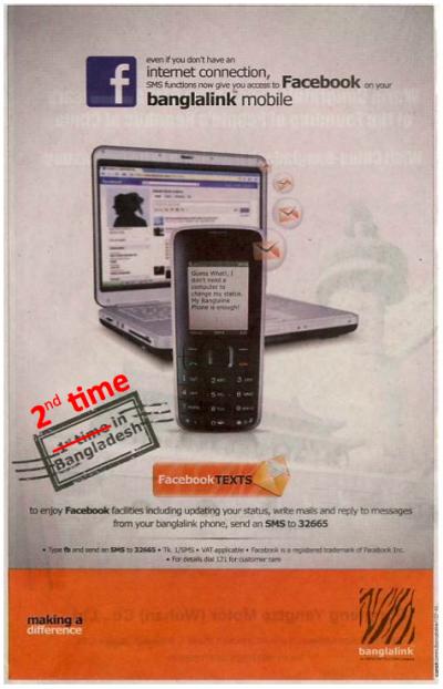we have offered facebook updates through sms via aawaj since mid 2009. as you see above, we have taken the liberty to modify the banglalink ad found in the newspapers last friday.