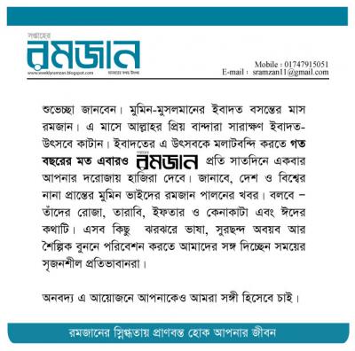 ইবাদত বসন্তের মাস রমজান নিয়ে দেশের প্রথম পত্রিকা_ সপ্তাহের রমজান। ২০১১ সালে রমজানে ৪টি সংখ্যা বের হবার পর লুফে নিয়েছিলেন পাঠক ও শুভানুধ্যায়ীরা। তাদের উত্সাহ আর প্রেরণায় এবারও বের হবে সপ্তাহের রমজান। একটি ঈদ সংখ্যাসহ চারিট সংখ্যা তুলে দেওয়া হবে আপনাদের হাতে।