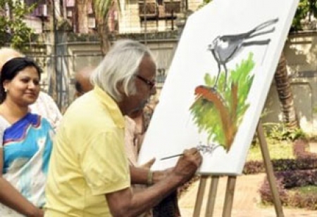 (কলকাতায় দুই বাংলার চিত্রকরদের আর্ট ক্যাম্পে উদ্বোধনী ছবি আঁকছেন কাইয়ুম চৌধুরী)