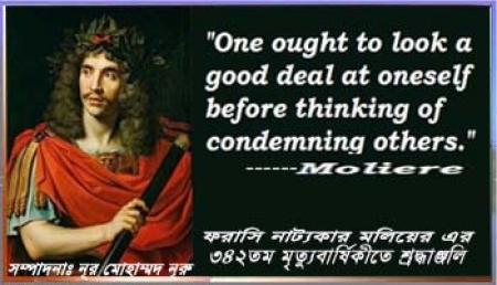 পশ্চিমা সাহিত্যের সেরা হাস্য-রসাত্বক লেখকদের একজন হিসেবে খ্যাত ফরাসী নাট্যকার ও অভিনেতা মলিয়ের। তার রচনাগুলোর মধ্যে ল্য মিসান্থ্রপি, ল্য এক্ল্ দেস্ ফেমেস্, টারটুফে অউ ল্য ইম্পোস্তার, ল্য আভ্রে, ল্য মালাদে ইমাজিনারে, ল্য বুর্জোয়িস জেন্টিওম্মে উল্লেখযোগ্য। তত্কালীন ফরাসি রাজার চোখে পড়ায় মলিয়েরের নাট্যদল রাজভাতাও লাভ করেছিল। রাজার সুনজরে পড়ার সুবাদে তার নাট্যদল রাজ ভাতাও লাভ করে এবং ত্রপে দে র্য বা রাজনাট্যদল উপাধিতে ভূষিত হয়। বিনোদনের জন্য সরকারী লেখক হিসেবে মলিয়ের নিয়োজিত হন। যদিও তিনি রাজা ও প্যারিসের অধিবাসীদের ভূয়সী প্রশংসা পান, তার বিদ্রূপাত্মক লেখা নীতিবাদী ও ক্যাথলিক চার্চের সমালোচনার মুখে পড়ে। ধর্মীয় ভণ্ডামিকে আক্রমণ করে তার একটি লেখা চার্চের তীব্র সমালোচনার মুখে পড়ে এবং এর ওপর নিষেধাজ্ঞা জারি করা হয়। ১৬৭৩ সালের আজকের দিনে ফুসফুসজনিত যক্ষ্মায় আক্রান্ত হয়ে তিনি মৃত্যুবরণ করেন। নাট্যকার ও অভিনেতা মলিয়েরের আজ ৩৪২তম মৃত্যুবার্ষিকী। মলিয়ের এর মৃত্যুদিনে আমাদের শ্রদ্ধাঞ্জলি।