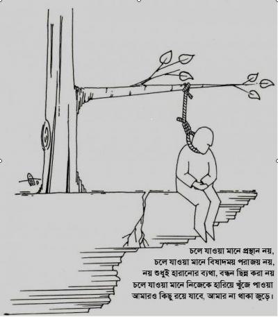 অগুনিত আঁকিবুকি আটকে থাকে মগজের গলিতে, কথার মাঝে লুকিয়ে বেদনার ফিসফিস দীর্ঘশ্বাস, মনপেয়ালায় ঝোড়ো হাওয়া ব্যাঘাত ঘটায় আঘাতে, আকাশের ব্ল্যাকবোর্ডে মেঘের শোকগাঁথা, অভিমানী মেঘ গলে গেলে মুছে যাবে মনের ব্যাথা, কলমের আঁকিবুকি দিয়ে যায় সেই আশ্বাস । ভোরের আলো ফুটে উঠছে । ঝিরঝির বৃষ্টি পড়ছে, চাপা ব্যথা গুলো শ্রাবন জলে ভিযে যাক । নিবিড় দুঃখের উৎস থেকে জন্ম হোক সবুজ । পাতারা জাগে উঠুক অদ্ভুত চেতনায় ।