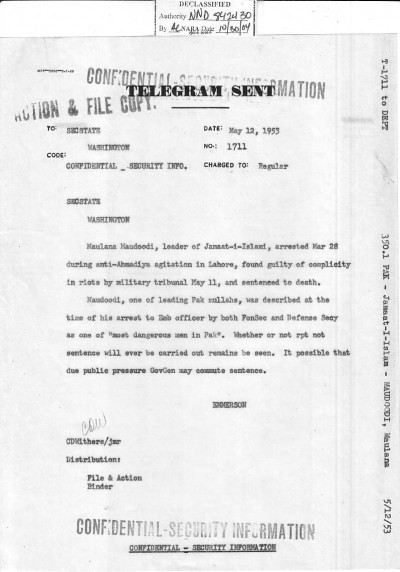 এক ব্লগারের মওদুদী নামা পইরা ভীষণ ভক্ত হইয়া পড়ছিলাম। আশা করি আপনাদের অনেকেই হইছে। তো লোকটারে পাক সরকার 1953 সালের 11 মে এক সামরিক ট্রাইবুনালে দাঙ্গার চক্রান্তকারী হিসেবে মৃতু্যদন্ড দেয়। যদিও তা বাস্তবায়ন হয় নাই। সহি সালামতে অনেক বছর বাচছেন তিনি। তো মৃতু্যদন্ড ঘোষণার পরপরই আমেরিকান সরকারী গোয়েন্দা সংস্থার কাছে পাকিস্তান থাইকা যে রিপোর্টটা গেছিল তা তুইলা দিলাম। ক্লাসিফাইড এই রকম অনেক ডকুমেন্ট ডিক্লাসিফাইড হইতাছে, যা আমাদের মতো সাধারণ মানুষের হাতে পইরা চিন্তাভাবনার নতুন দিগন্ত খুইলা দিতাছে।