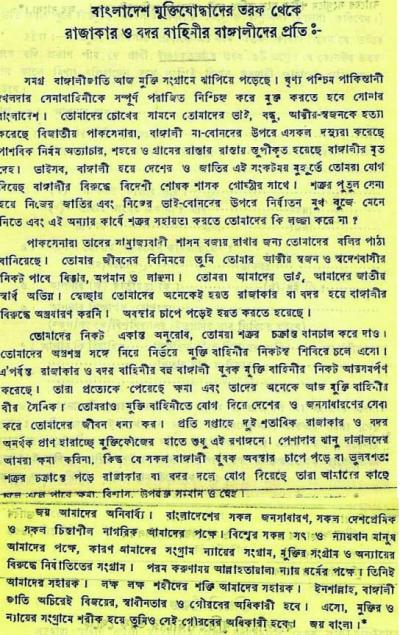 উপরের আহবানটি মুক্তিযুদ্ধের সময়কার। ৬ নম্বর সেক্টরের মুক্তিযোদ্ধারা রাজাকার-আলবদরদের একটা সুযোগ নিতে বলেছিল স্বাধীনতার পক্ষে চলে এসে। যারা এসেছিল, ক্ষমা পেয়েছিল। যারা আসেনি, তাদের জন্য ছিল লজ্জা, হেনস্থা, প্রকারান্তরে মৃত্যুও। আরো একদল ছিল, যারা ক্ষমা চায়নি। এখনও চায় না। তাদের দুষ্কর্ম জায়েজ করতে তারা সগর্বে বলে চলে তারা ভুল করেনি। স্বাধীনতার পর তারা কোনো না কোনোভাবে পালিয়ে গিয়েছিল। সুযোগ পেয়ে ভোল পাল্টে ফিরে এসেছে। কিন্তু কথা পাল্টায়নি। একদল লোভী রাজনৈতিকের সঙ্গ পেয়ে এরা এখনও মুক্তিযুদ্ধ নিয়ে যা-তা বলার অপপ্রয়াস পায়। এরা ক্ষমার অযোগ্য।]