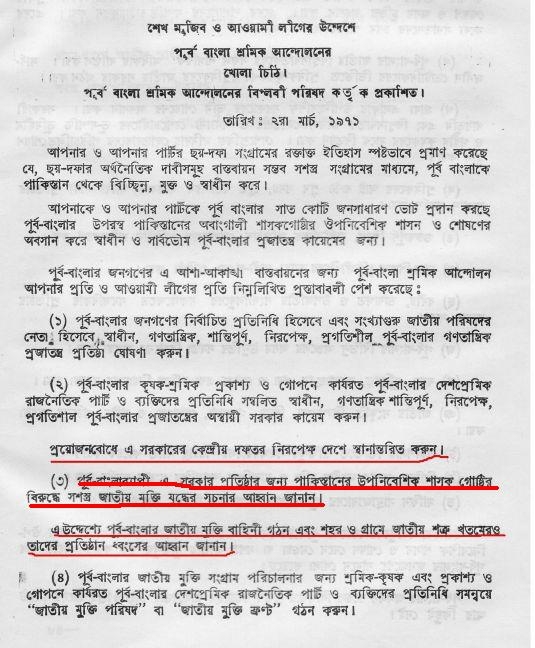 কিন্তু পূর্ব পাকিস্তান কম্যুনিস্ট পার্টির (এম-এল) তোয়াহা, হক, মতিনদের এই লাইন কিন্তু সিরাজ শুরুতে একদমই নেননি। বরং EBWM-এর প্রথম থিসিসে শেখ মুজিবর রহমানকে কৌশলগত মিত্র হিসেবে উল্লেখ করে তাকে সহায়তা করার সিদ্ধান্তই ছিলো তার। ১ মার্চ ১৯৭১ সালে পাকিস্তানের প্রেসিডেন্ট ইয়াহিয়া খান যথন সংসদ অধিবেশন স্থগিত করার ঘোষণা দেন, উত্তাল হয়ে ওঠে গোটা বাংলা। পরদিন ২ মার্চ EBWM-এর এক ইশতেহারে শেখ মুজিবকে সশস্ত্র মুক্তিযুদ্ধ শুরু করার আহবান জানান সিরাজ শিকদার। সেখানে সর্বস্তরের দেশপ্রেমিক প্রতিনিধিদের নিয়ে একটি অস্থায়ী বিপ্লবী জোট সরকার গঠন এবং সশস্ত্র মুক্তিযুদ্ধ পরিচালনার জন্য জাতীয় মুক্তিযুদ্ধ পরিষদ গঠনের অনুরোধ ছিলো। এক্ষেত্রে উল্লেখ্য সেদিনের পত্রপত্রিকায় গোলাম আযম থেকে শুরু করে সবুর খানসহ শেষ পর্যন্ত মুক্তিযুদ্ধের বিপক্ষ শক্তি হিসেবে প্রতিষ্ঠিত হওয়া সব রাজনৈতিক নেতাই ইয়াহিয়াকে অনুরোধ জানান মুজিবের হাতে ক্ষমতা তুলে দিতে। কিন্তু সিরাজ বুঝেছিলেন যুদ্ধ ভিন্ন পথ নেই। মুজিব প্রত্যাখ্যান করলেন তার প্রস্তাব।